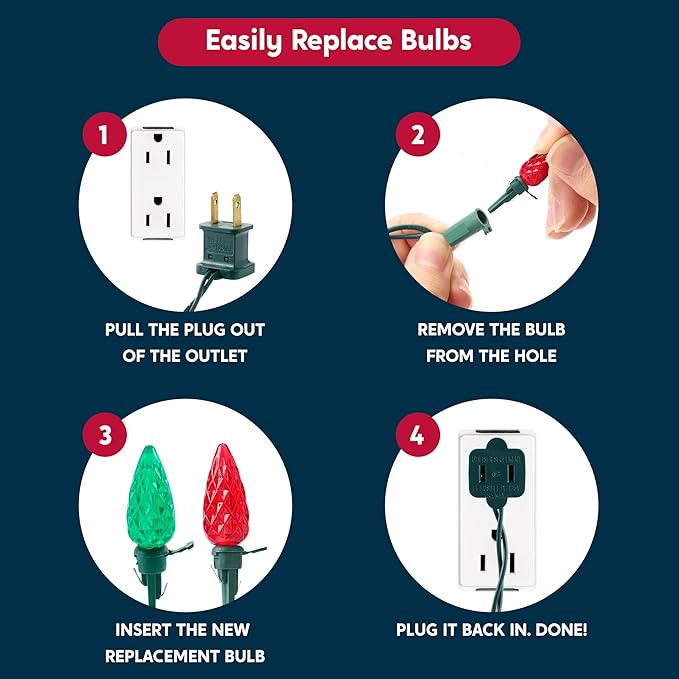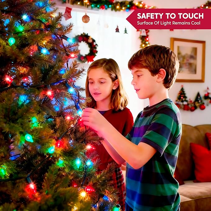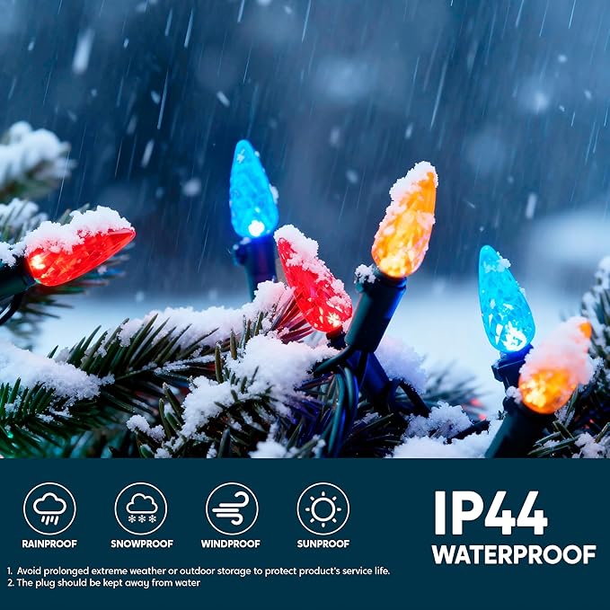 - 【Brilliant & Shatterproof Design】The faceted C6 bulbs are crafted from good material, sturdy, made to last, delivering exceptional brightness, rich color saturation, and UV resistance to hinder fading. Built-in LED creates dazzling lighting effects. String your tree with confidence using these shatterproof C6 LED lights. Engineered to be impact-resistant and incredibly-durable, they can survive accidental drops from heights, so your holidays glow bright and worry-free.