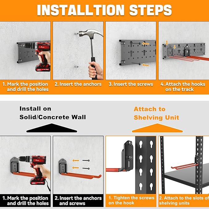 - Customizable and Easy Installation: Our tools rack includes 3 separate tracks and 2 mini plates, allowing you to arrange them to fit your garage space. Installation is simple with pre-aligned holes for easy mounting on 16" studs
