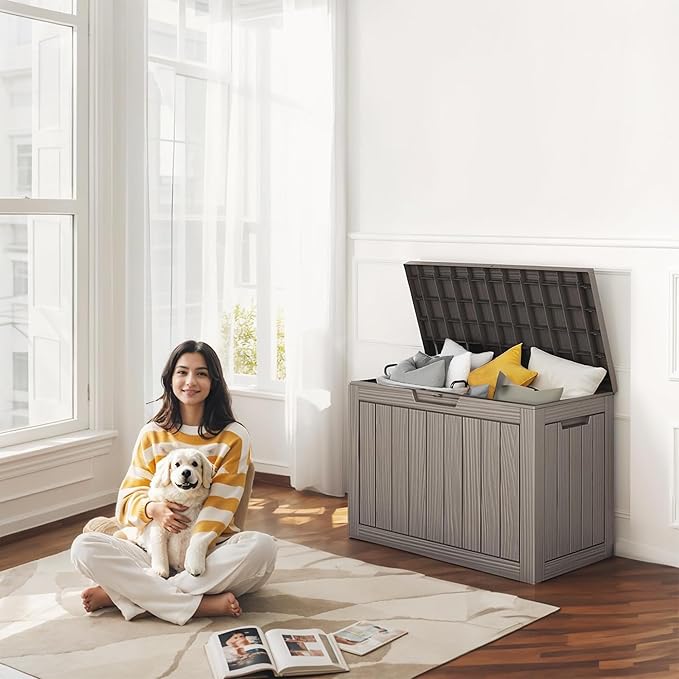 - EXTRA SEAT OR TABLE: Doubling as a seat or table, this deck box supports up to 230 lbs. Use it as a patio chair, a handy coffee table, or even a sturdy footrest, making it functional for both indoor and outdoor use.