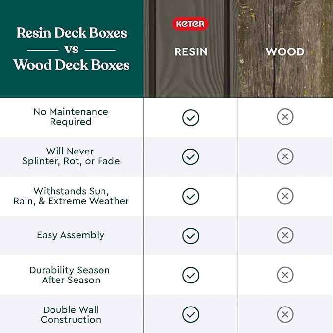 - DURABLE & ATTRACTIVE RESIN CABINET: This deck storage box is attractive and rugged and is made from strong, durable resin with a wood-plank look. It has an easy-lift mechanism for an effortless open and a quiet close.
