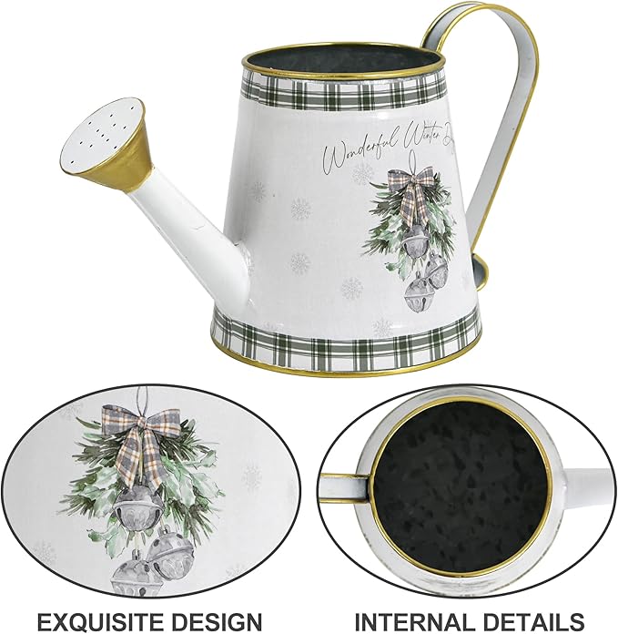 - 【FESTIVE CHRISTMAS DESIGN】This watering can features a charming white color with gold - toned accents on the spout and rim. Adorned with a green and white plaid pattern near the top and bottom, it also showcases a beautiful wreath with bells in the center. The text "Wonderful Winter Days" adds a touch of holiday cheer, making it a perfect addition to your Christmas decor.