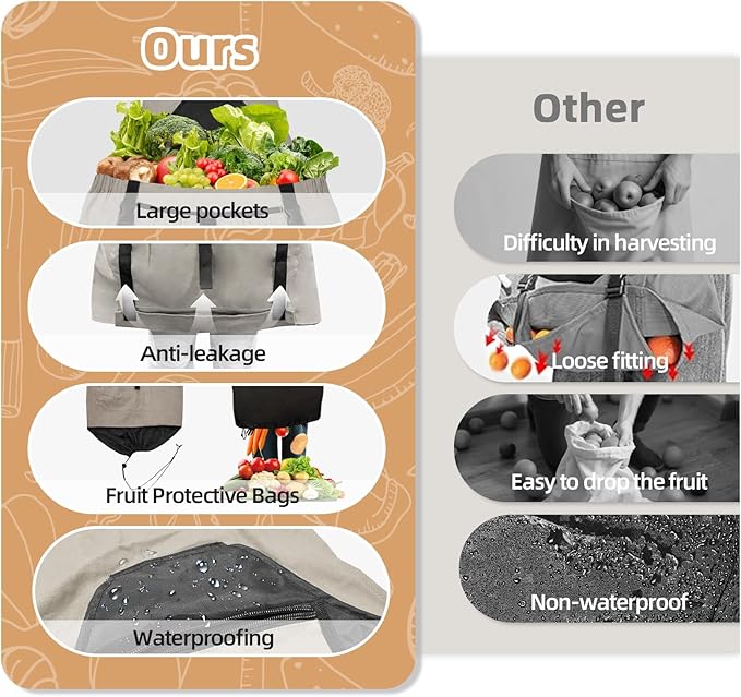 - Bottom Edge Anti-Drop Design: The apron has a deep release pocket, complete with an internal waterproof drawstring bag. It can effectively prevent small fruits and vegetables from falling off the edge of the apron. In this way, when you bend over during gardening work, you don’t have to worry about fruits or vegetables falling from the edge gap. It is suitable for harvesting any size fruits or vegetables.