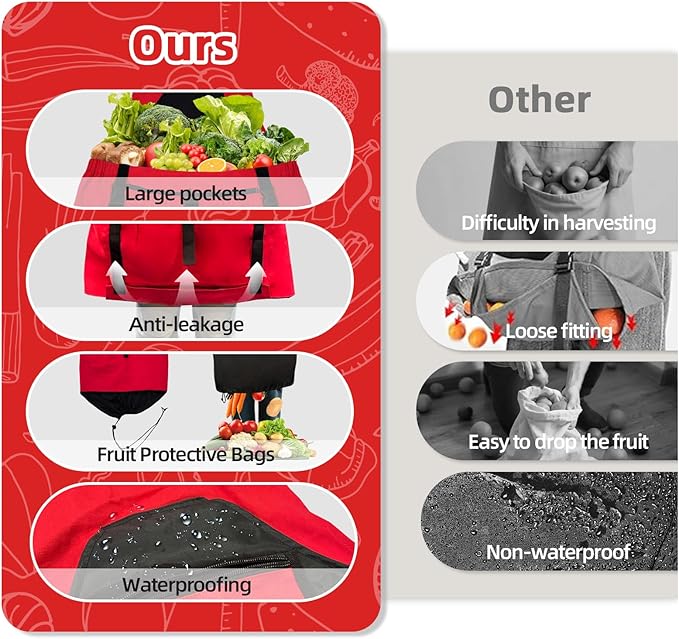 • Bottom Edge Anti-Drop Design: The apron has a deep release pocket, complete with an internal waterproof drawstring bag. It can effectively prevent small fruits and vegetables from falling off the edge of the apron. In this way, when you bend over during gardening work, you don’t have to worry about fruits or vegetables falling from the edge gap. It is suitable for harvesting any size fruits or vegetables.