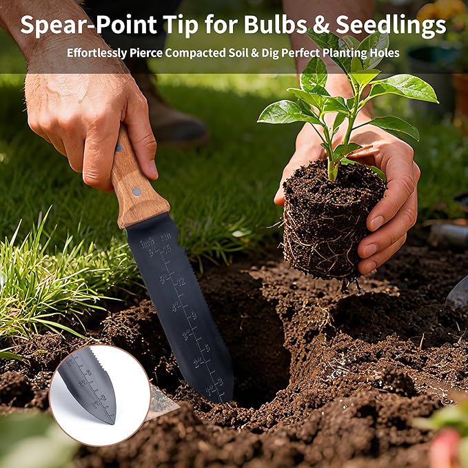 - Versatile Dual-Edge Blade for Multiple Tasks: The straight edge handles digging, weeding, and precise trimming (diseased leaves/spent flowers). The serrated edge tackles tough roots and small branches. A rope-cutting notch slices twine fast. Ensure perfect planting accuracy with permanent stamped depth guides that resist fading.