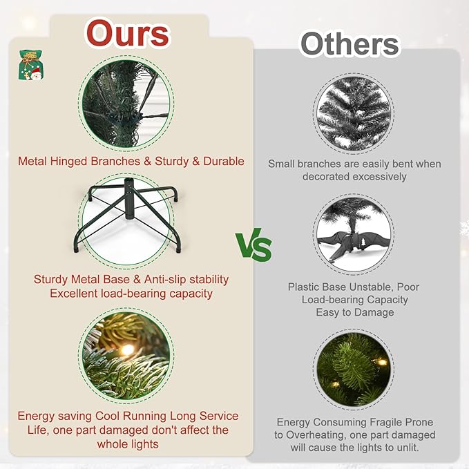 - đăHigh-efficiency, energy-saving LED bulbsăThe pre-lit holiday Christmas tree is equipped with 500 warm white LED bulbs, UL certified, energy-efficient, heat-free, evenly distributed across the branches, and can be lit directly, providing continuous and long-lasting help for your holiday decorations.