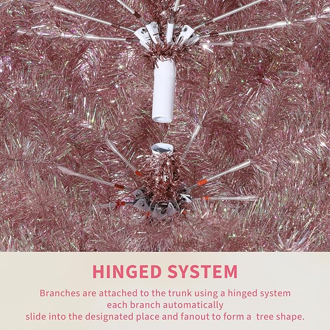 - Extremely Realistic and Lush Design: Featuring hundreds of detailed branch and needles, this rose gold tinsel tree delivers a natural, full-bodied look that rivals real trees. Its unique metallic hue adds festive flair for Christmas and all your holiday decorating needs.