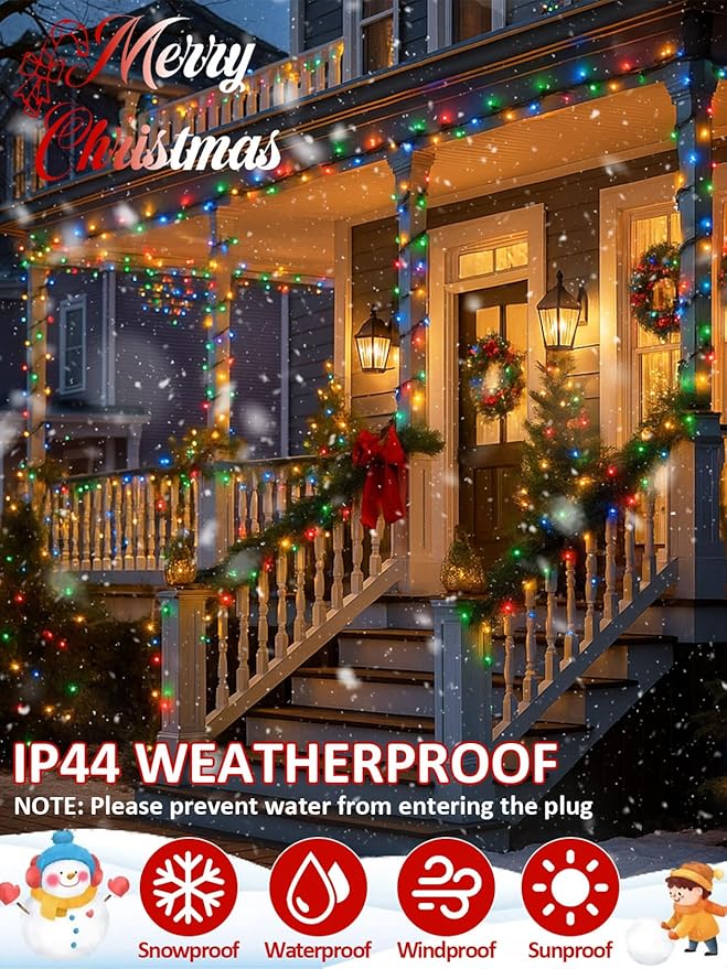 - Waterproof Christmas String Lights Outdoor: Our durable multicolor twinkle lights are IP44 waterproof and designed for unpredictable weather conditions, protecting against strong winds, rain, snow, and high temperatures, providing stable light. The green wire blends seamlessly into your Christmas tree and outdoor landscape, enhance your overall decor. The 29V low-voltage plug ensures safety and durability. Note: Keep the plug dry. Light is shining, laughter is echoing, Christmas is coming!