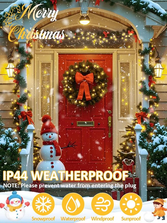 - Waterproof Christmas String Lights Outdoor: Our durable warm twinkle lights are IP44 waterproof and designed for unpredictable weather conditions, protecting against strong winds, rain, snow, and high temperatures, providing stable light. The green wire blends seamlessly into your Christmas tree and outdoor landscape, enhance your overall decor. The 29V low-voltage plug ensures safety and durability. Note: Keep the plug dry. Light is shining, laughter is echoing, Christmas is coming!