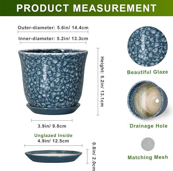- Ideal Size: This ceramic plant pot measures 5.6'' x 5.6'' x 5.2'' and comes with drainage holes and a ceramic saucer, creating a healthier environment for plants while keeping your space neat and clean