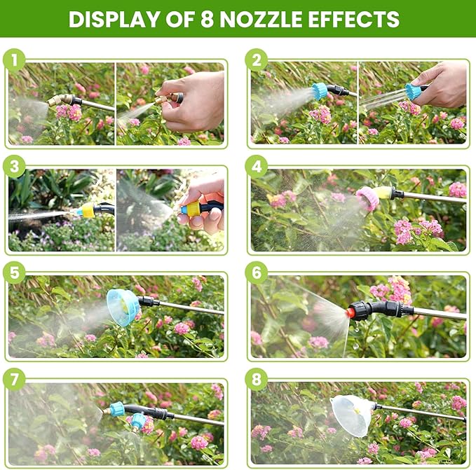 - Multi-Spray Electric Sprayer:Effortlessly switch between fine mist (gentle watering), straight jet (targeted cleaning), and wide fan spray (broad coverage) using the interchangeable brass nozzles. Customize the spray pattern for precision tasks in lawn and garden applications.