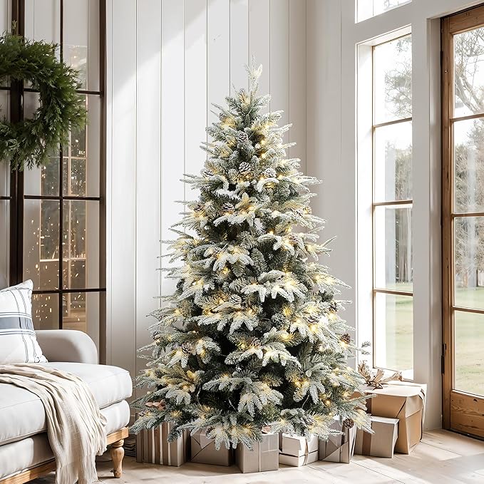 - Elegant Winter Aesthetic: This 7ft Christmas tree features snow-covered PE+PVC branches and natural pine cones, creating a realistic winter wonderland look perfect for holiday decorations and Christmas home décor.