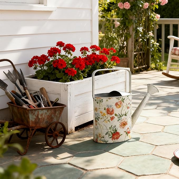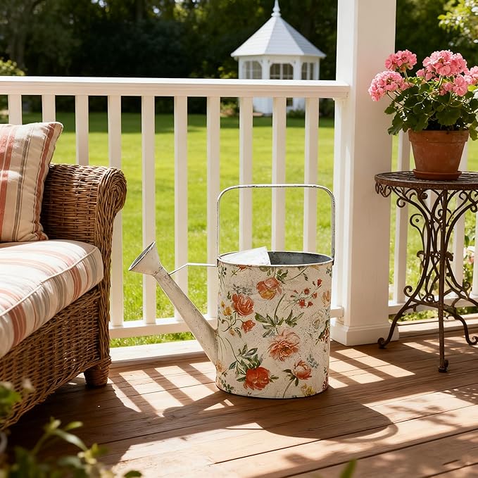- 【BEAUTIFUL FLORAL DESIGN】This watering can features a charming white metal body adorned with vibrant floral prints, including bright orange and red roses, along with green leaves and other delicate blossoms. Measuring 13" in length, 12.4" in height, and 5.2" in width, it adds a touch of garden - inspired elegance to any space.