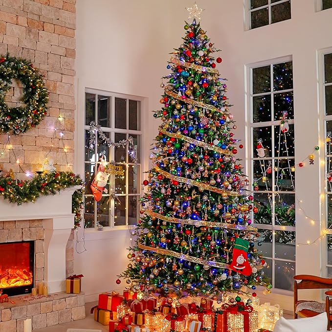 - Pre-Lit Christmas Tree: Elevate your holiday decor with this 9ft Christmas tree, pre-strung with 600 innovative color-changing LED lights that let you craft custom light shows. Each UL-certified bulb is designed for safety and reliability, even if one burns out, the rest remain illuminated, ensuring your tree’s sparkle never dims. A convenient foot pedal switch adds effortless control, letting you cycle through 10 preset light colors to match your mood or occasion.