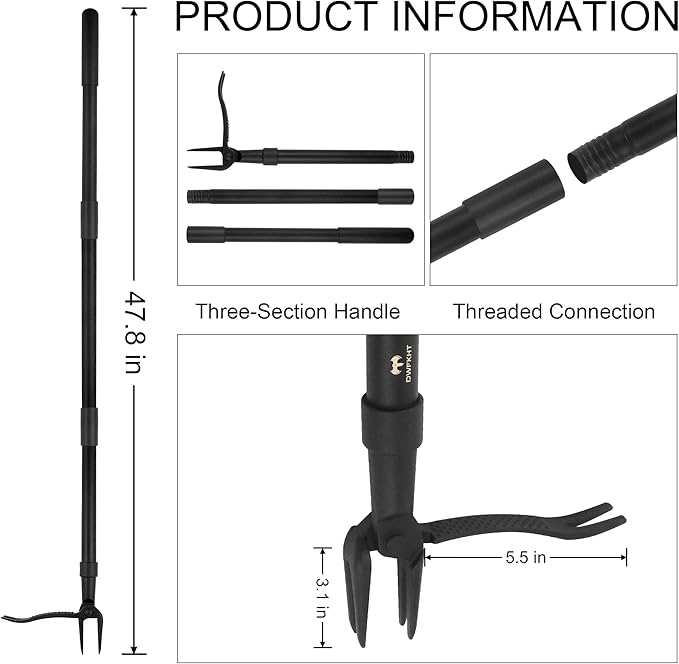 - 【Adjustable & Compact Storage】The weed puller comes with a 3-section detachable handle for easy storage and adjustable length. Remove one section to shorten it to 32.6 inches, suitable for kids or when a smaller weeding tool is preferred.