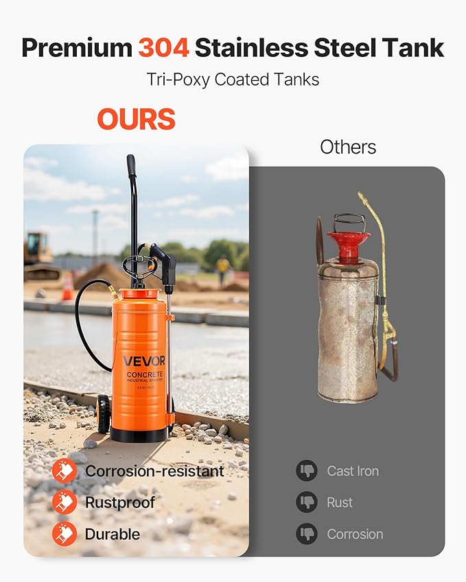 VEVOR Industrial Concrete Sprayer with Wheeled Cart, 3.5 Gallon Stainless Steel Sprayer, Heavy Duty Tri-Poxy Pump Sprayers, 20.5"Wand, 48" & 120"Hoses, 2 Brass Nozzles for Construction, Lawn & Garden