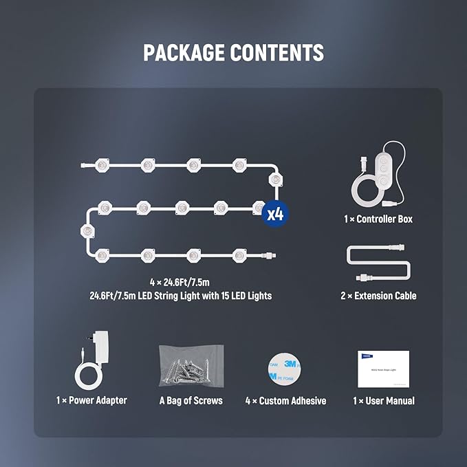 - 【Upgraded RGBCW Mixing Technology】 Each 24ft/7.5m string contains 15 LED lights (4 strings included, 96ft/30m in total), with each light integrating 7 RGB, cool white, and warm white LEDs, delivering 50 lm per LED light and a color temperature range of 2700K-6500K. These dimmable decorative colored lights as outdoor color changing lighting products create dreamy, colorful RGB effects while also providing bright dual color white lighting for versatile ambiance