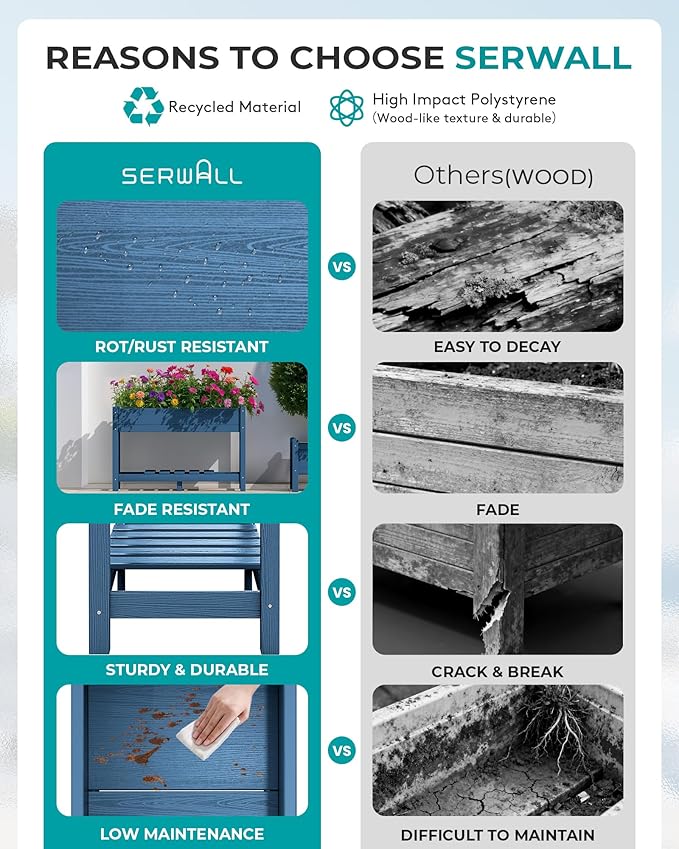 - HDPE MATERIAL- Made from 100% HDPE material, SERWALL outdoor raised garden bed offers high strength and stability, ensuring a long service life. SERWALL raised bed is durable for outdoor use in any weather condition.