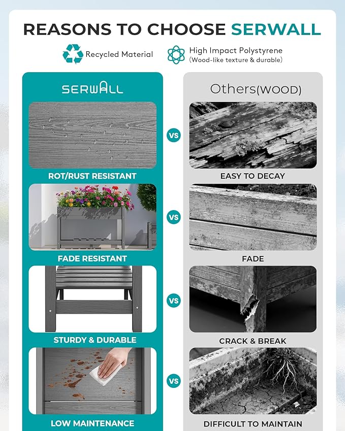 - HDPE MATERIAL- Made from 100% HDPE material, SERWALL outdoor raised garden bed offers high strength and stability, ensuring a long service life. SERWALL raised bed is durable for outdoor use in any weather condition.