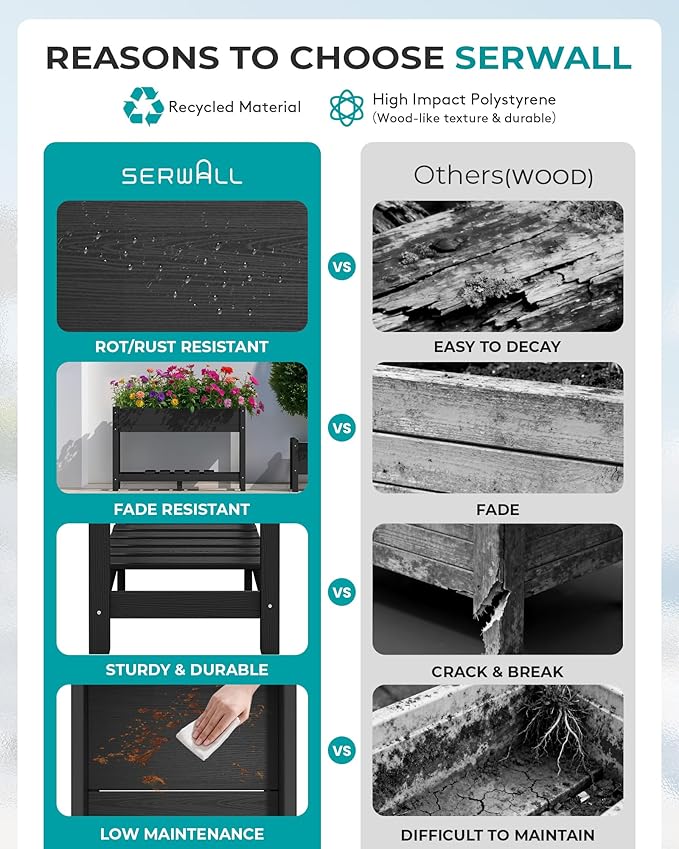 - HDPE MATERIAL- Made from 100% HDPE material, SERWALL outdoor raised garden bed offers high strength and stability, ensuring a long service life. SERWALL raised bed is durable for outdoor use in any weather condition.